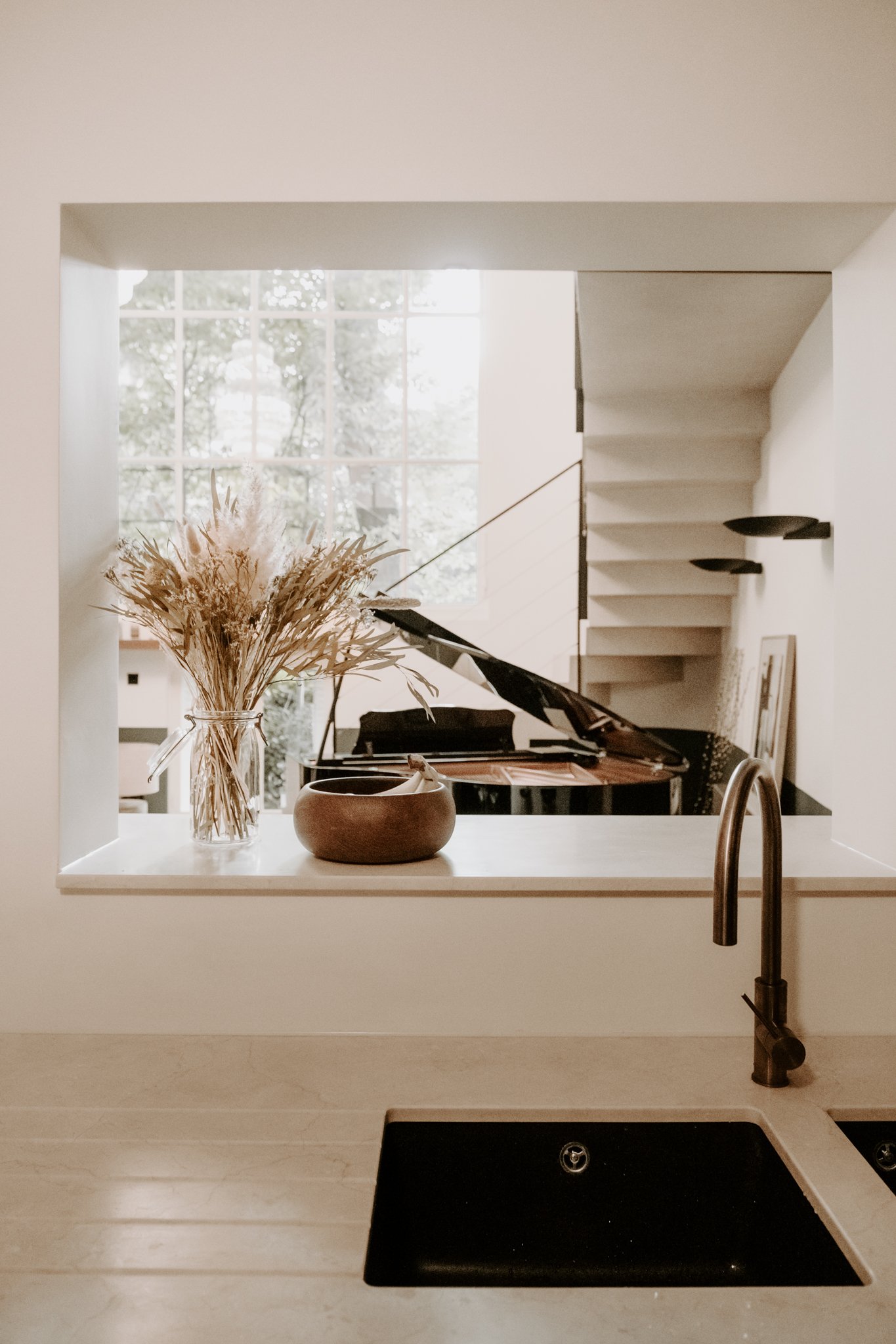 L’agencement intérieur est à l’image d’un couple aux personnalités opposées : lui introverti adepte des espaces structurés et minimalistes, elle extravertie à l’aise dans les espaces ouverts et conviviaux.