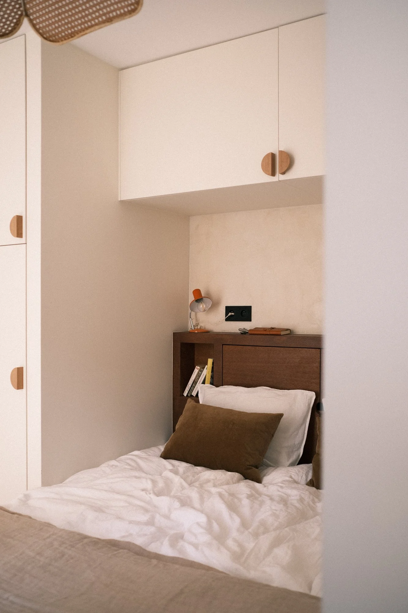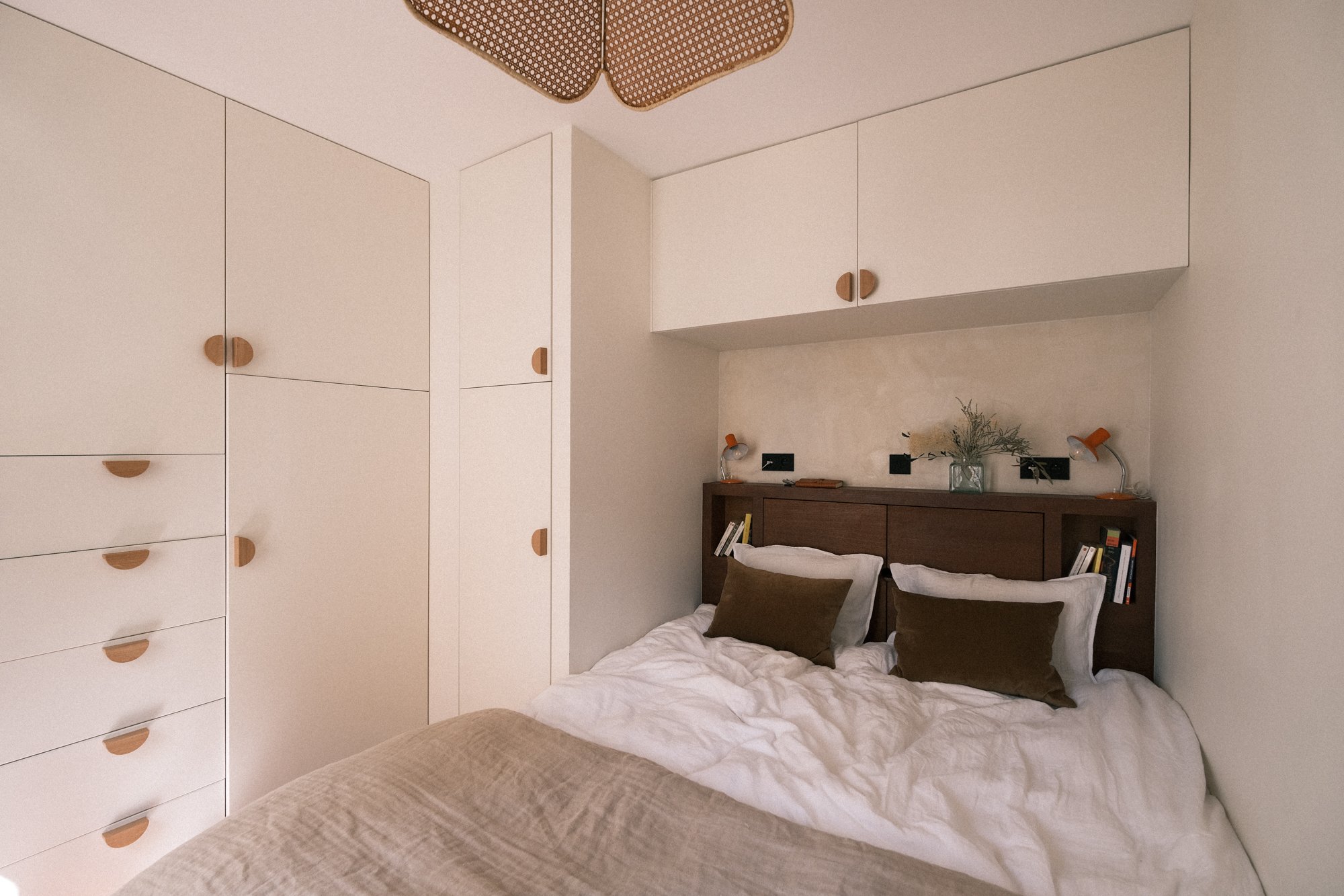 Les rangements et mobiliers sur mesure sont dessinés dans chaque pièce pour optimiser les espaces : rangements/banquette en allège de fenêtre pour une sieste au soleil, dressing compact et enveloppant dans la chambre, îlot de cuisine ergonomique.