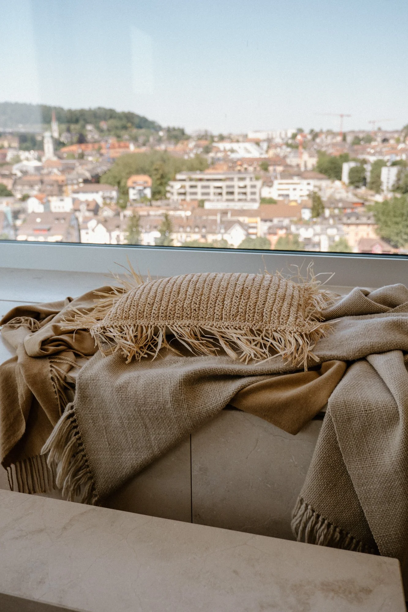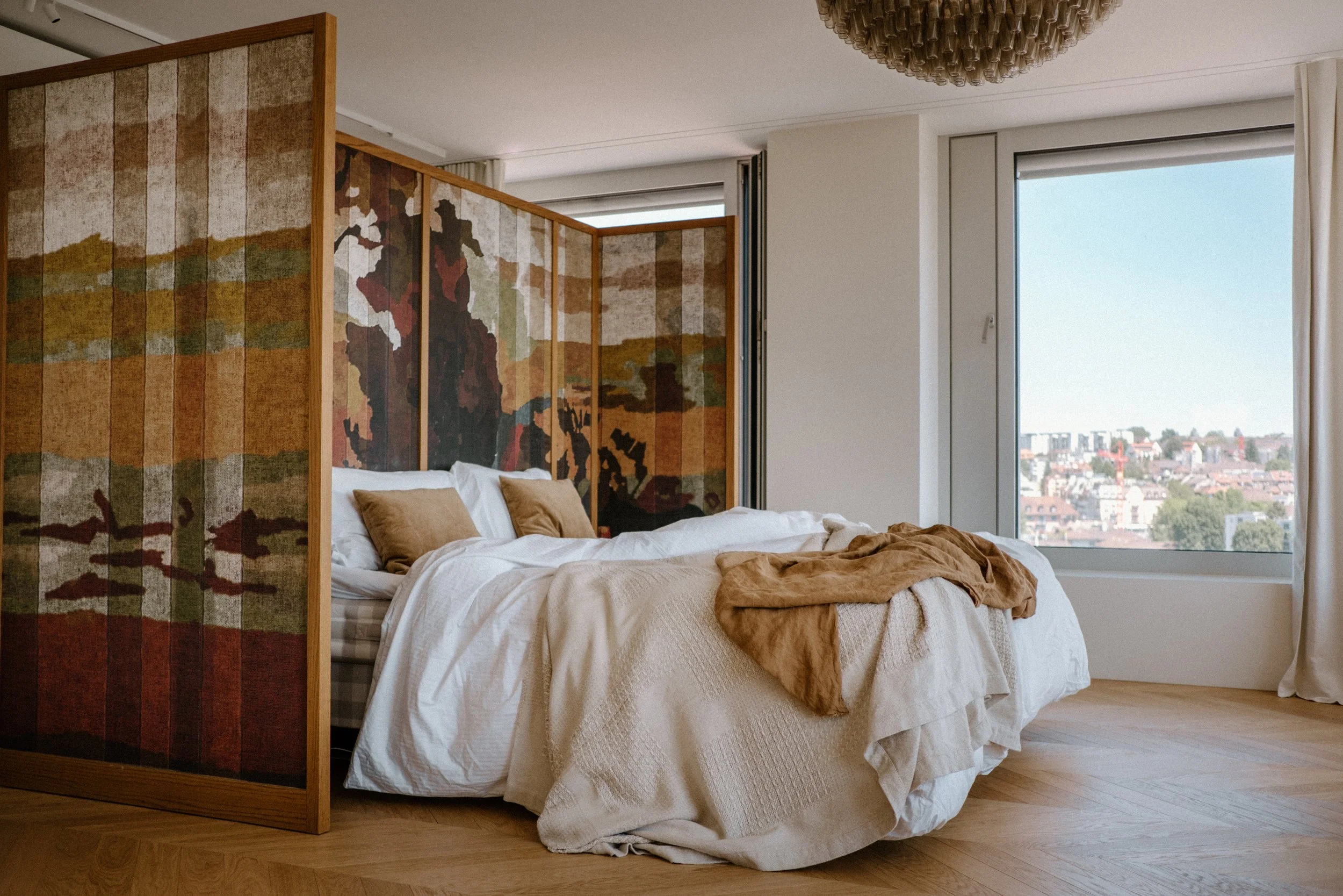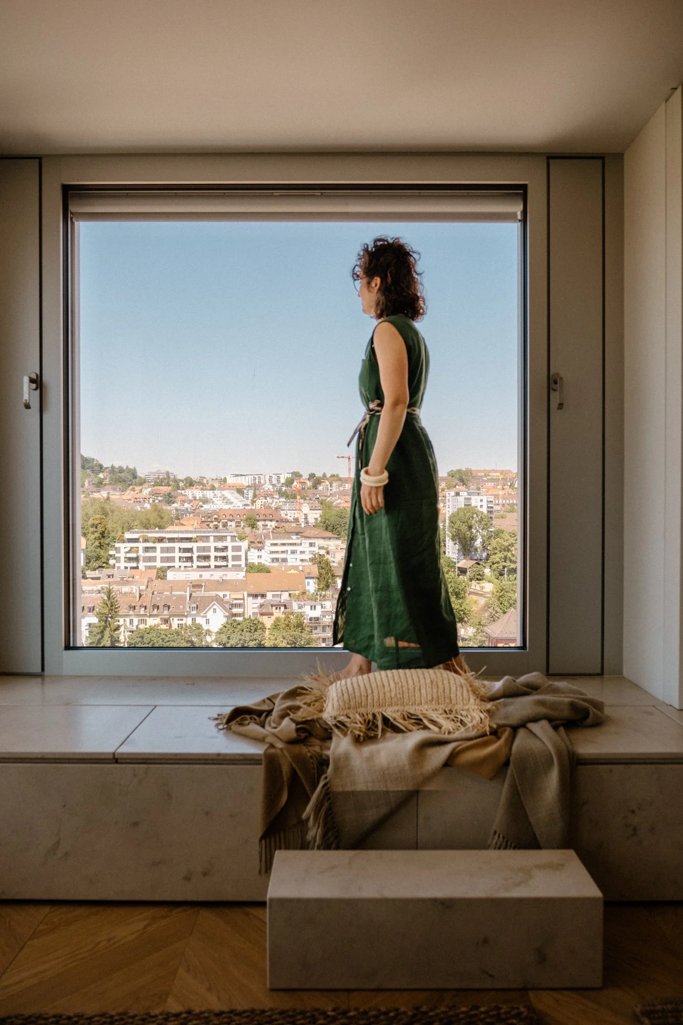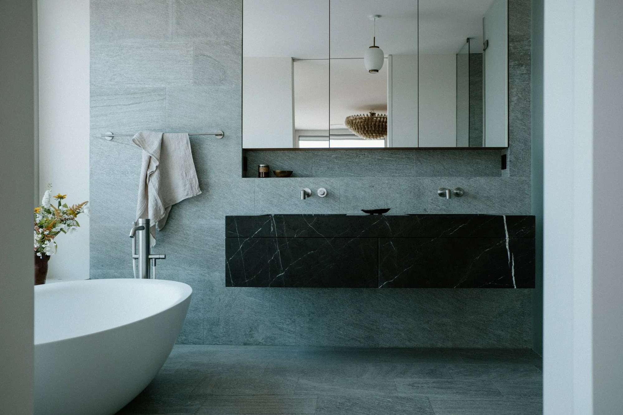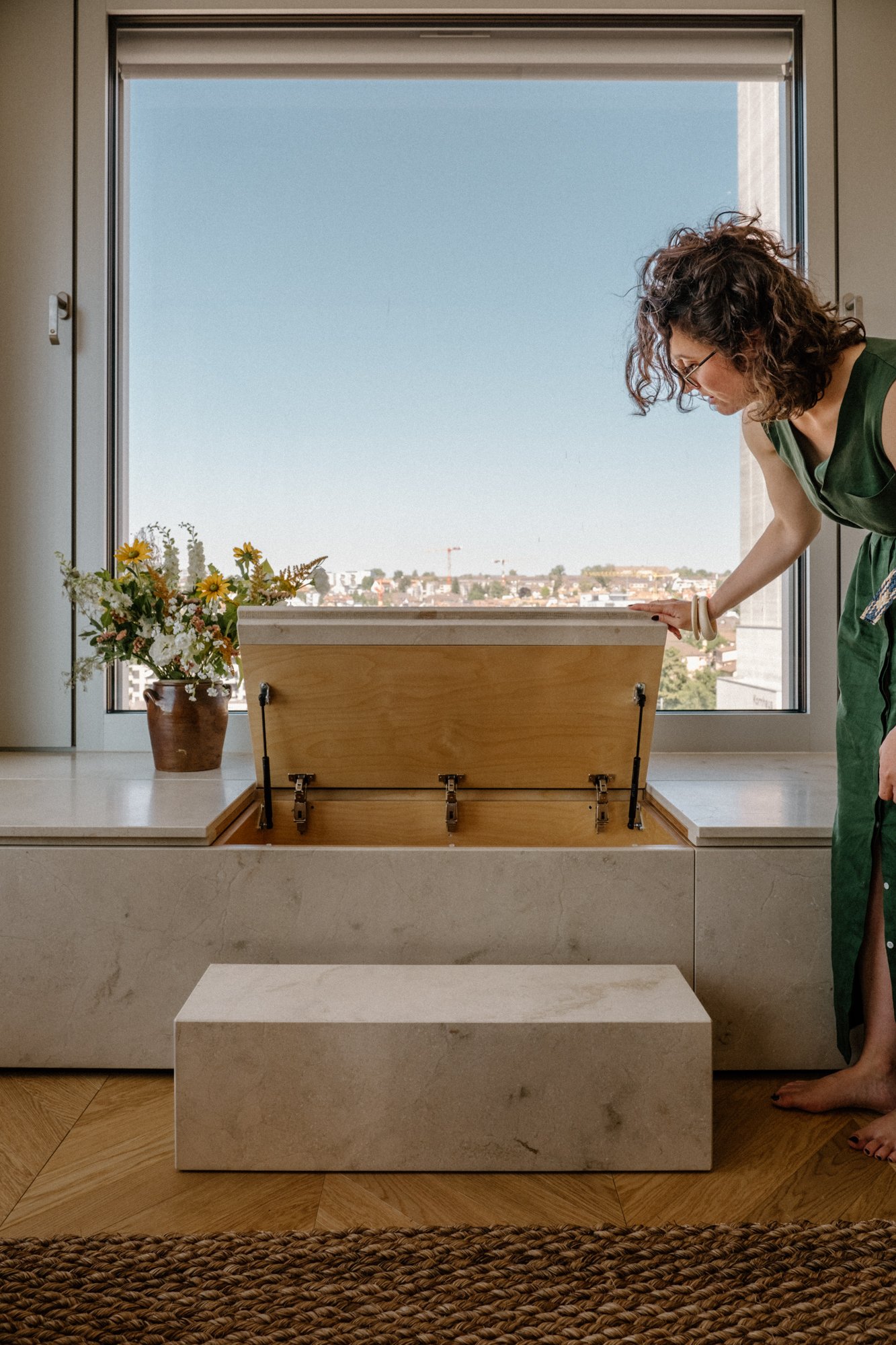 A la première visite, les espaces paraissent froids et austères. Notre mission est de créer une ambiance chaleureuse, tout en restant dans l’esprit épuré et dessiné de l’architecture suisse. Les matériaux choisis sont nobles et naturels. Beaucoup d’éléments sont dessinés sur mesure notamment la méridienne/coffre en marbre, la tête de lit et meuble vasque de la suite parentale.