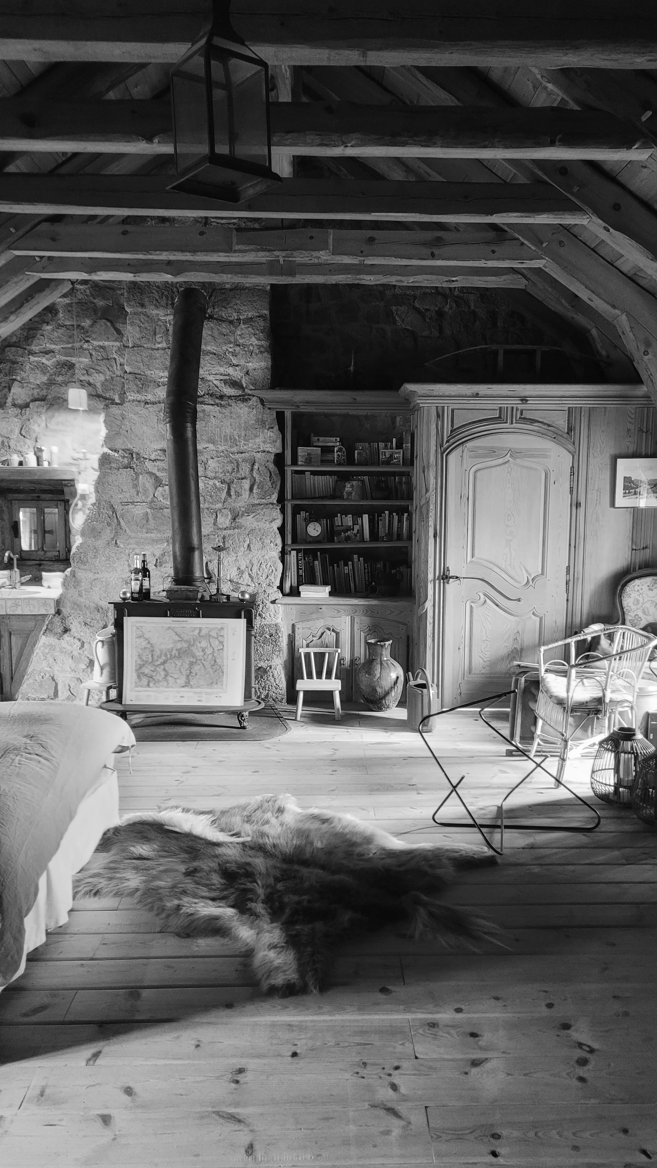 Le foyer ouvert d’époque est restauré en granit local et mis en œuvre de manière traditionnelle.