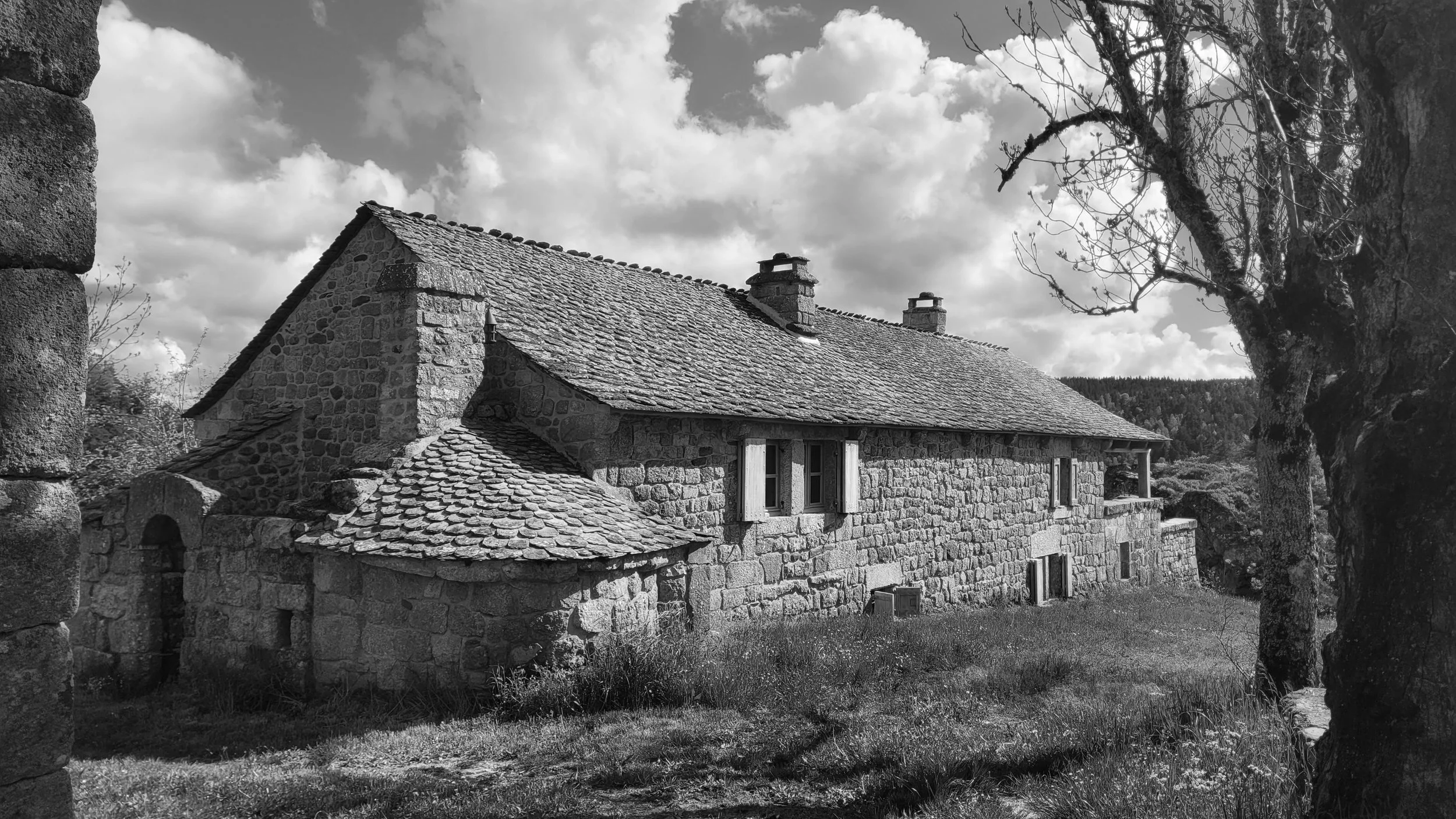 Mur de granit, charpentes en chêne, toiture en lauzes, cette structure imposante donne à la bâtisse un aspect massif et protecteur. Toutefois, l’inconvénient de ces constructions est l’ambiance austère et sombre des volumes intérieurs.